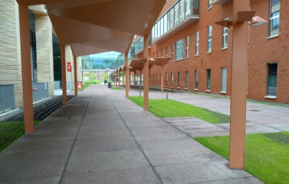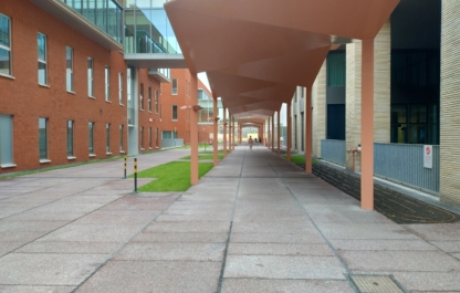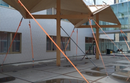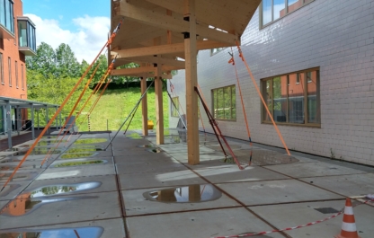 We optimaliseerden het ontwerp voor een droogloopluifel tussen verschillende gebouwen op de site van het academisch ziekenhuis Gasthuisberg. NU architectuuratelier zorgde voor een basisontwerp, en een in-situ mock-up. We voerden met Computational Fluid Dynamics (CFD) een numerieke simulatie uit van de windomstandigheden in de zuidoost-gerichte buitenruimte tussen middelhoge gebouwen. We analyseerden de regendruppeltrajecten (van kleine druppels tot grote) om te verzekeren dat mensen inderdaad droog de verschillende gebouwingangen kunnen bereiken. Onze analyses zorgen voor twee aanpassingen: de luifels werden asymmetrisch tegen de gebouwen geplaatst, en de centrale middenstijl werd vervangen door zijdelingse kolommen.