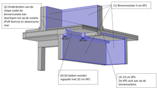 De thermische isolatie gebeurt op maat van de specifieke context (geluidproductie muziekacademie, lichte houtskeletoptopping, scheidingsmuur op perceel, beperkte hoogte parking …). Bouwfysisch vormt de betonnen structuur die doorloopt binnen – buiten, de uitdaging. Ondersteund door 3D-koudebrugberekeningen vonden we tijdens ontwerpbesprekingen met architecten samen esthetische oplossingen voor koudebruggen. Soms zetten we akoestische absorptie in om de koudebrugisolatie weg te werken. Sommige kolommen kregen door een kunstenaar een sculpturale (kunst)kolomomhulling.