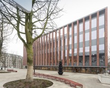 Het gebouw heeft een robuuste, massieve verschijningsvorm in roodbruine baksteen, afgestemd op het kleurenpalet van de stad. Een referentie naar het historische Brugge. Met hun solide karakter zorgen ze voor voldoende schaduw en fungeren ze als een geïntegreerde zonwering.